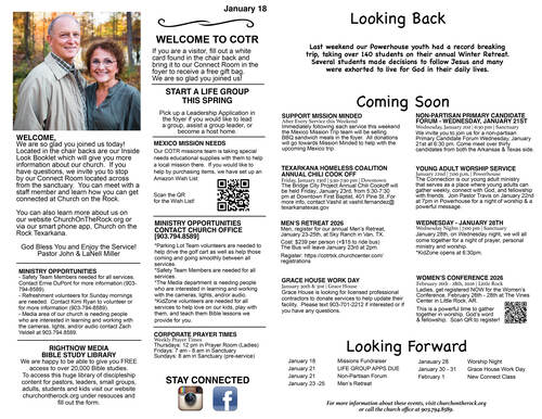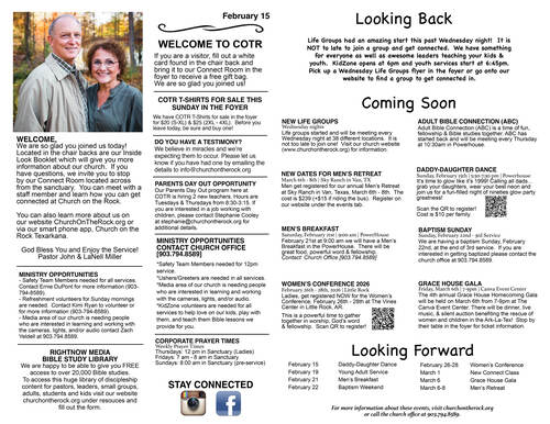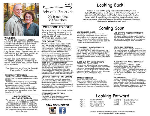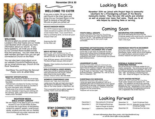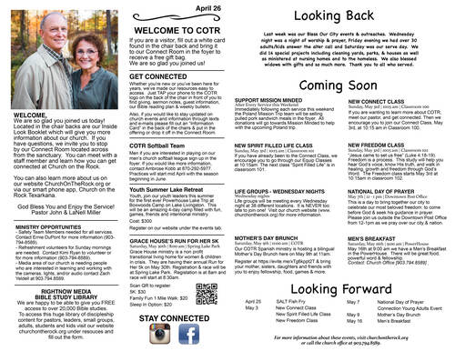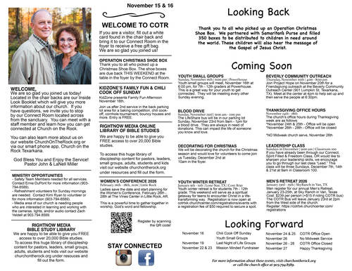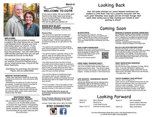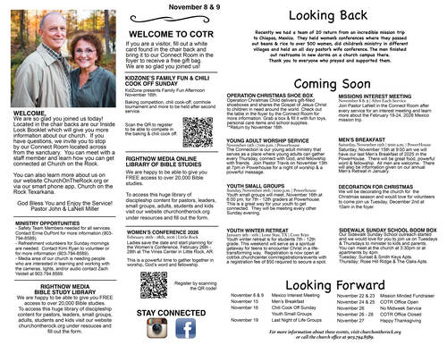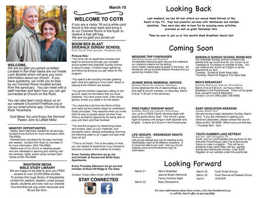 Here you can see a copy of our bulletin, which contains announcements, upcoming events, details about our Church... Really anything you need to know, it's here!
